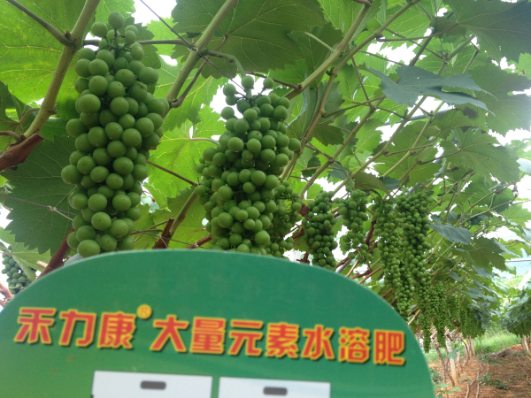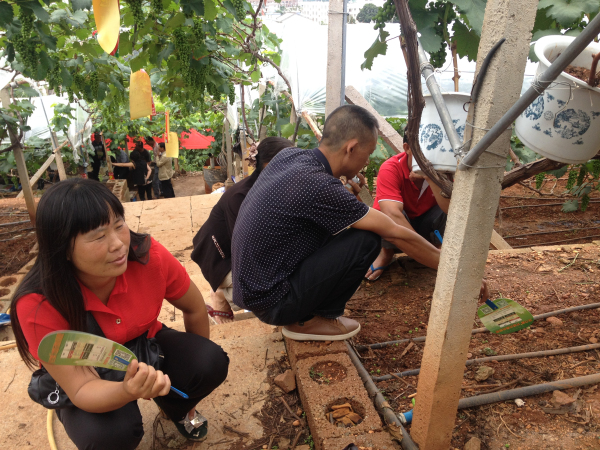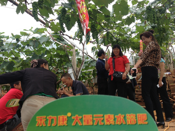 2015年8月30日,在云南賓川柳家灣村公司攜手當(dāng)?shù)嘏l(fā)商、零售商、基地種植戶、普通葡萄種植戶到田間現(xiàn)場觀摩了夏黑二花葡萄的禾力康水溶肥示范效果。